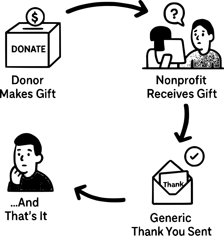Without stronger engagement, effective donor pipelines shrink—and long-term stability erodes with them. The current system creates a broken feedback loop: donor makes gift → nonprofit receives gift → generic thank you → that's it.